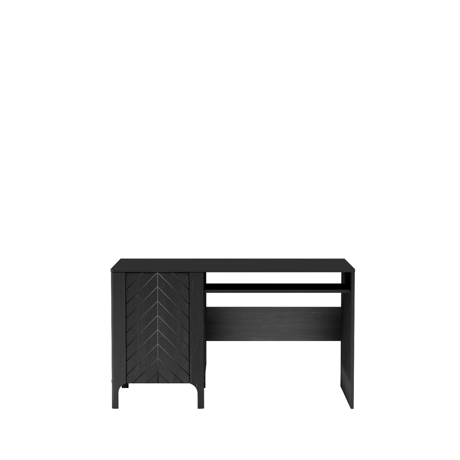 Eleganckie biurko o minimalistycznym designie zostało zaprojektowane z myślą o nowoczesnych przestrzeniach biurowych i domowych. Prosta forma połączona z dopracowanymi detalami sprawia, że mebel prezentuje się lekko, a jednocześnie funkcjonalnie.Biurko wyposażone jest w zamykaną szafkę z drzwiami ozdobionymi subtelnym wzorem w jodełkę, który nadaje całości eleganckiego i nowoczesnego charakteru. Wewnątrz znajduje się pojemna półka, umożliwiająca wygodne przechowywanie dokumentów, książek oraz akcesoriów biurowych, pomagając zachować porządek w miejscu pracy.