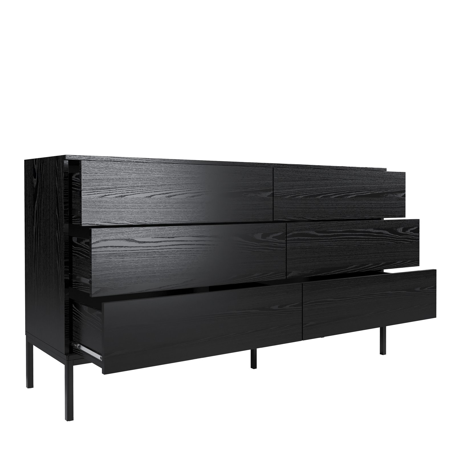 Komoda została wyposażona w 6 pojemnych szuflad, które bez trudu pomieszczą wszystkie niezbędne akcesoria – od dokumentów i tekstyliów, po elementy wyposażenia salonu. Każda szuflada posiada system Push to Open oraz pełny wysuw, co zapewnia wygodny dostęp do całej zawartości i podkreśla nowoczesny charakter mebla, pozbawionego uchwytów.