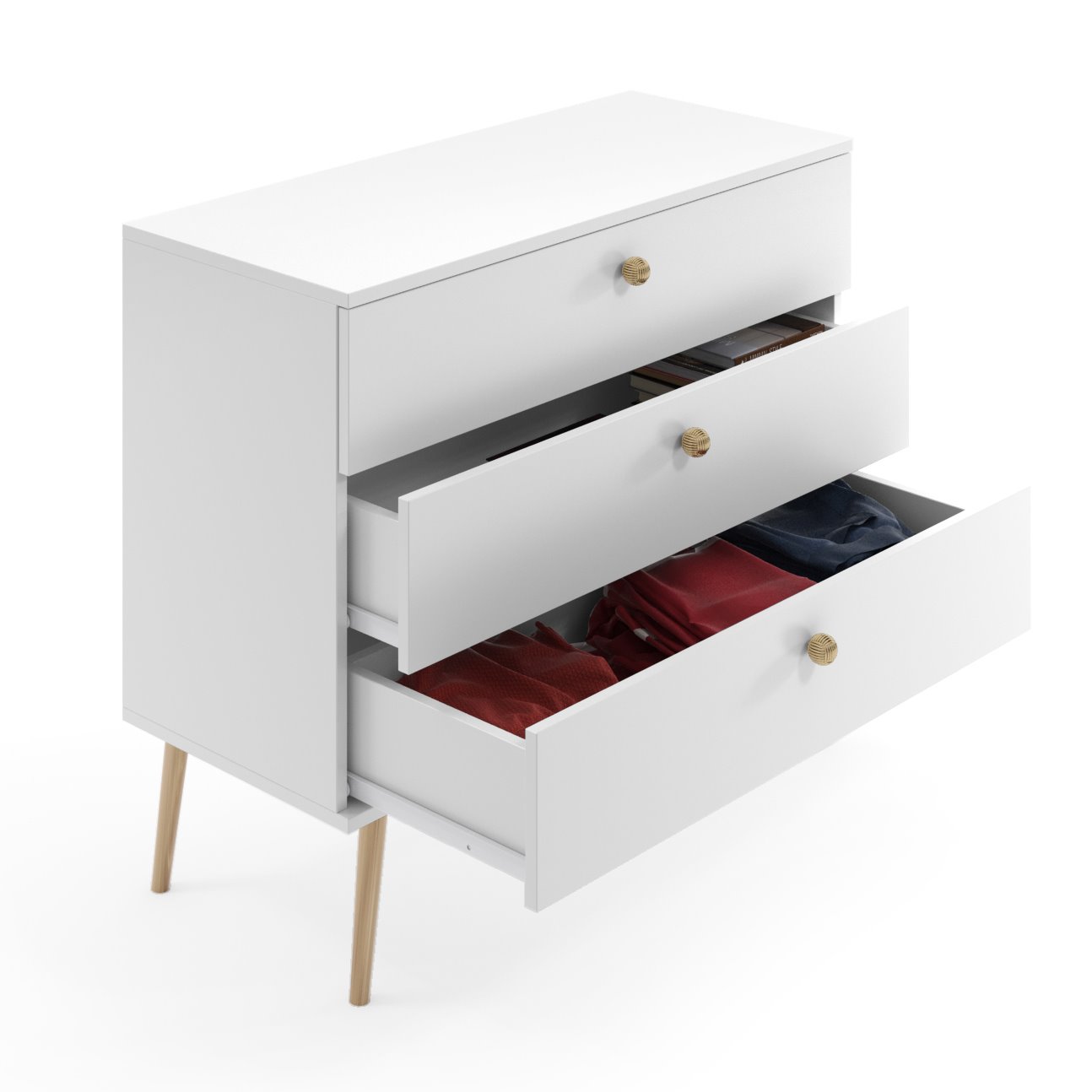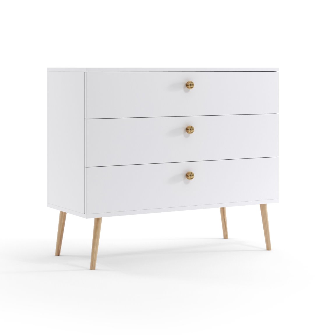Wnętrze komody kryje 3 pojemne szuflady, które umożliwiają wygodne przechowywanie ubrań, tekstyliów, dokumentów lub akcesoriów domowych. Każda szuflada oferuje dużą przestrzeń użytkową, dzięki czemu komoda sprawdzi się zarówno jako mebel do sypialni, jak i praktyczny element wyposażenia salonu czy przedpokoju.
