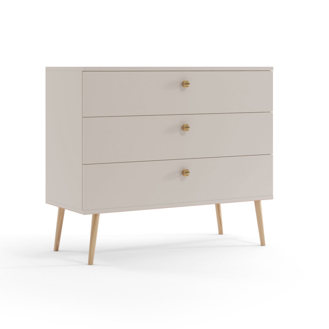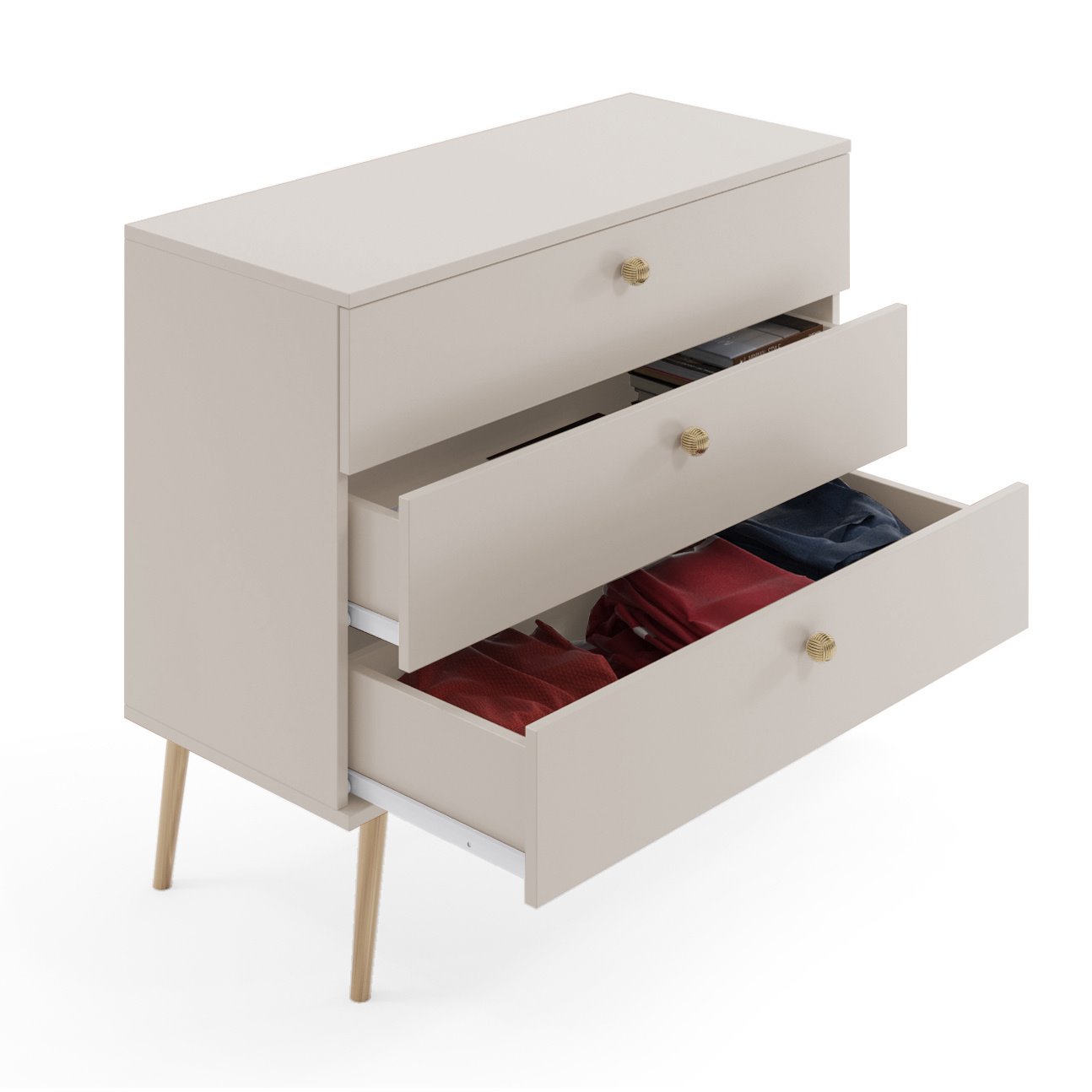 Wnętrze komody kryje 3 pojemne szuflady, które umożliwiają wygodne przechowywanie ubrań, tekstyliów, dokumentów lub akcesoriów domowych. Każda szuflada oferuje dużą przestrzeń użytkową, dzięki czemu komoda sprawdzi się zarówno jako mebel do sypialni, jak i praktyczny element wyposażenia salonu czy przedpokoju.