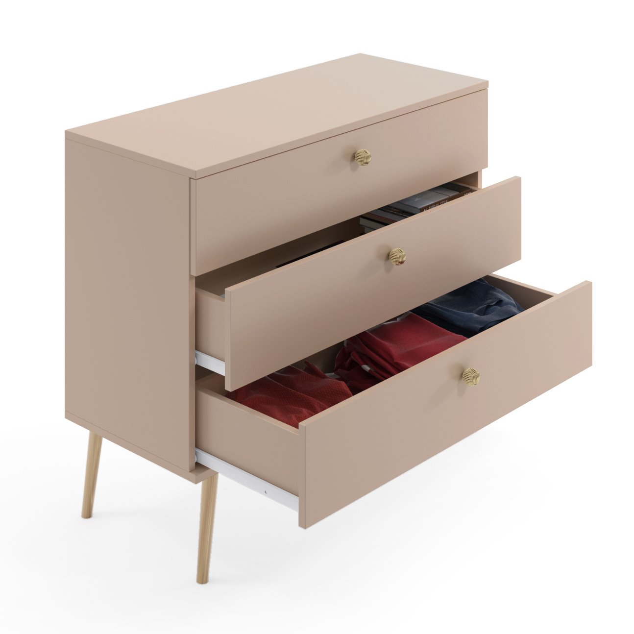 Wnętrze komody kryje 3 pojemne szuflady, które umożliwiają wygodne przechowywanie ubrań, tekstyliów, dokumentów lub akcesoriów domowych. Każda szuflada oferuje dużą przestrzeń użytkową, dzięki czemu komoda sprawdzi się zarówno jako mebel do sypialni, jak i praktyczny element wyposażenia salonu czy przedpokoju.