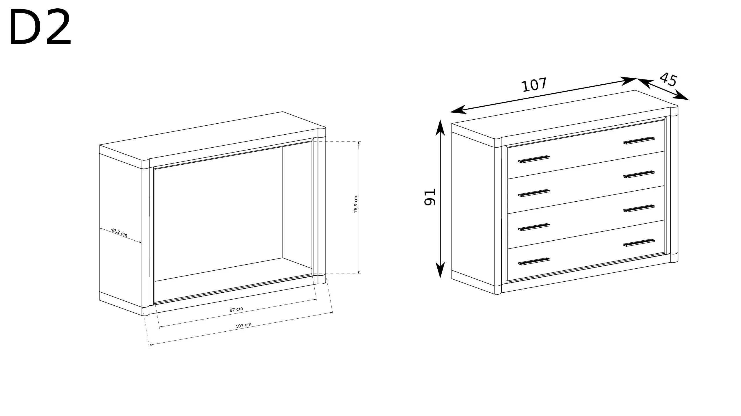 Komoda została wyposażona w cztery duże i pojemne szuflady, które umożliwiają łatwą organizację ubrań, akcesoriów, dokumentów oraz innych rzeczy codziennego użytku. Przemyślany układ sprawia, że korzystanie z mebla jest wygodne i intuicyjne, a utrzymanie porządku staje się znacznie prostsze.