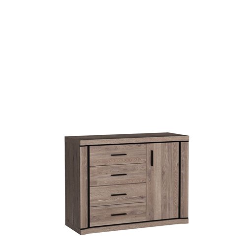 Komoda pomieści wiele ubrań, akcesoriów oraz przedmiotów codziennego użytku, pomagając zachować porządek i dobrą organizację wnętrza. Została wyposażona w cztery pojemne szuflady, które doskonale sprawdzą się do przechowywania odzieży, bielizny czy dokumentów.