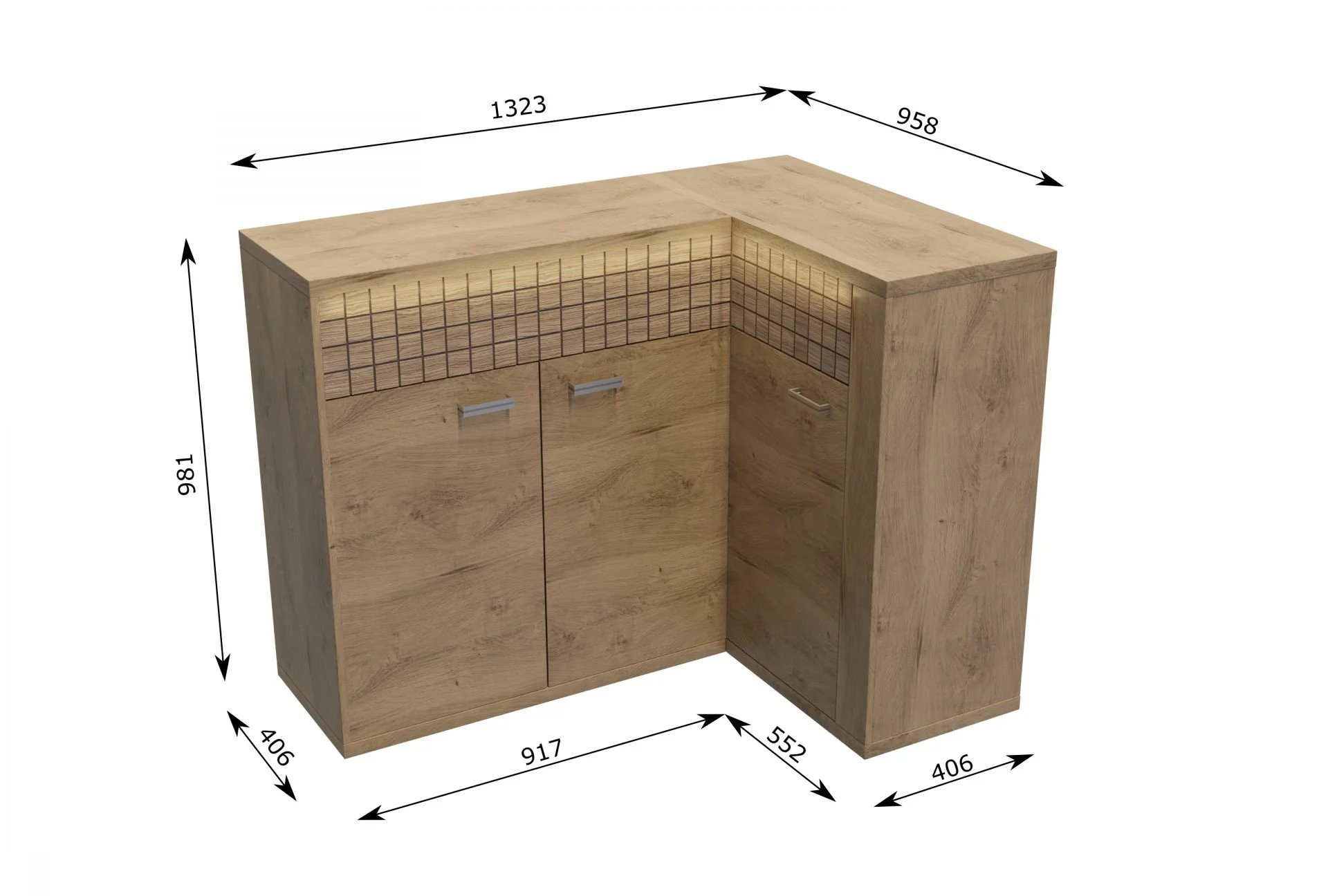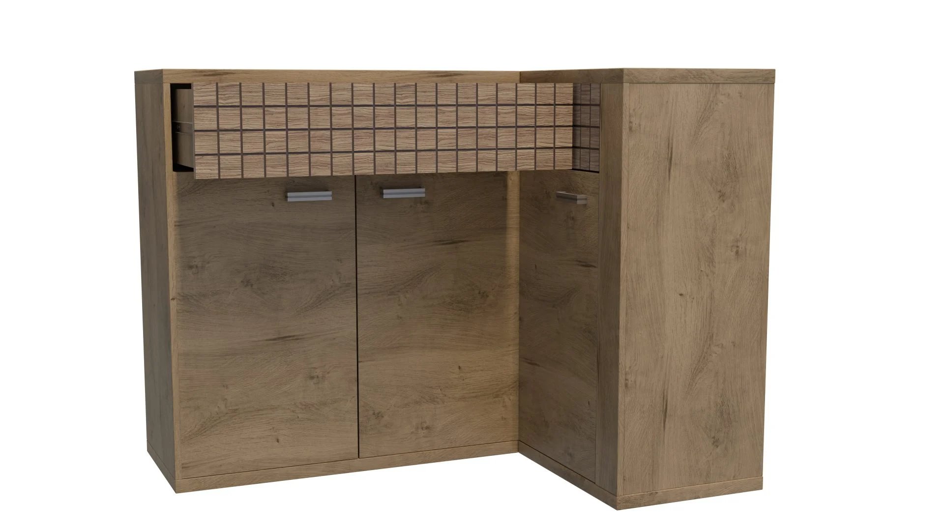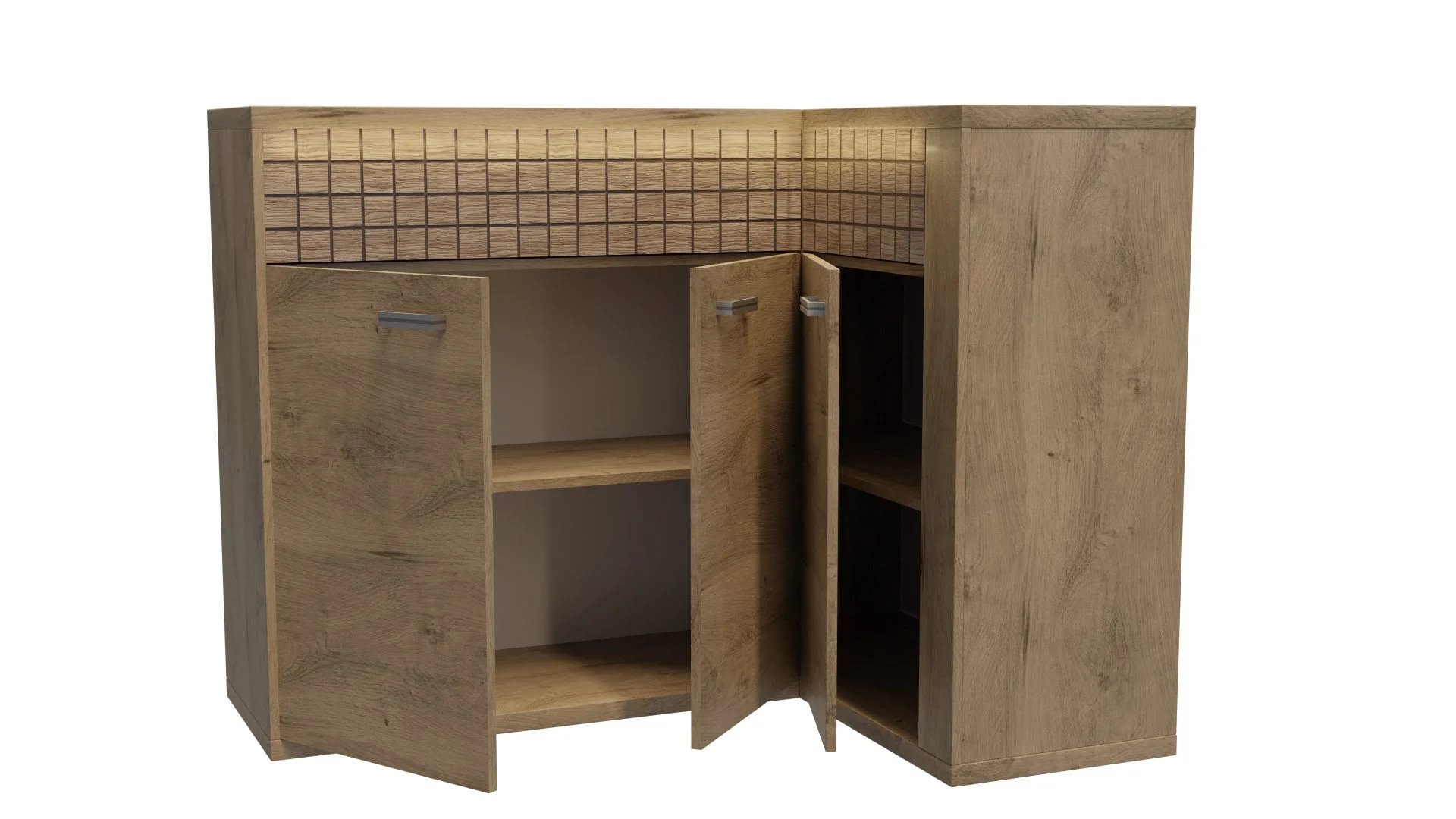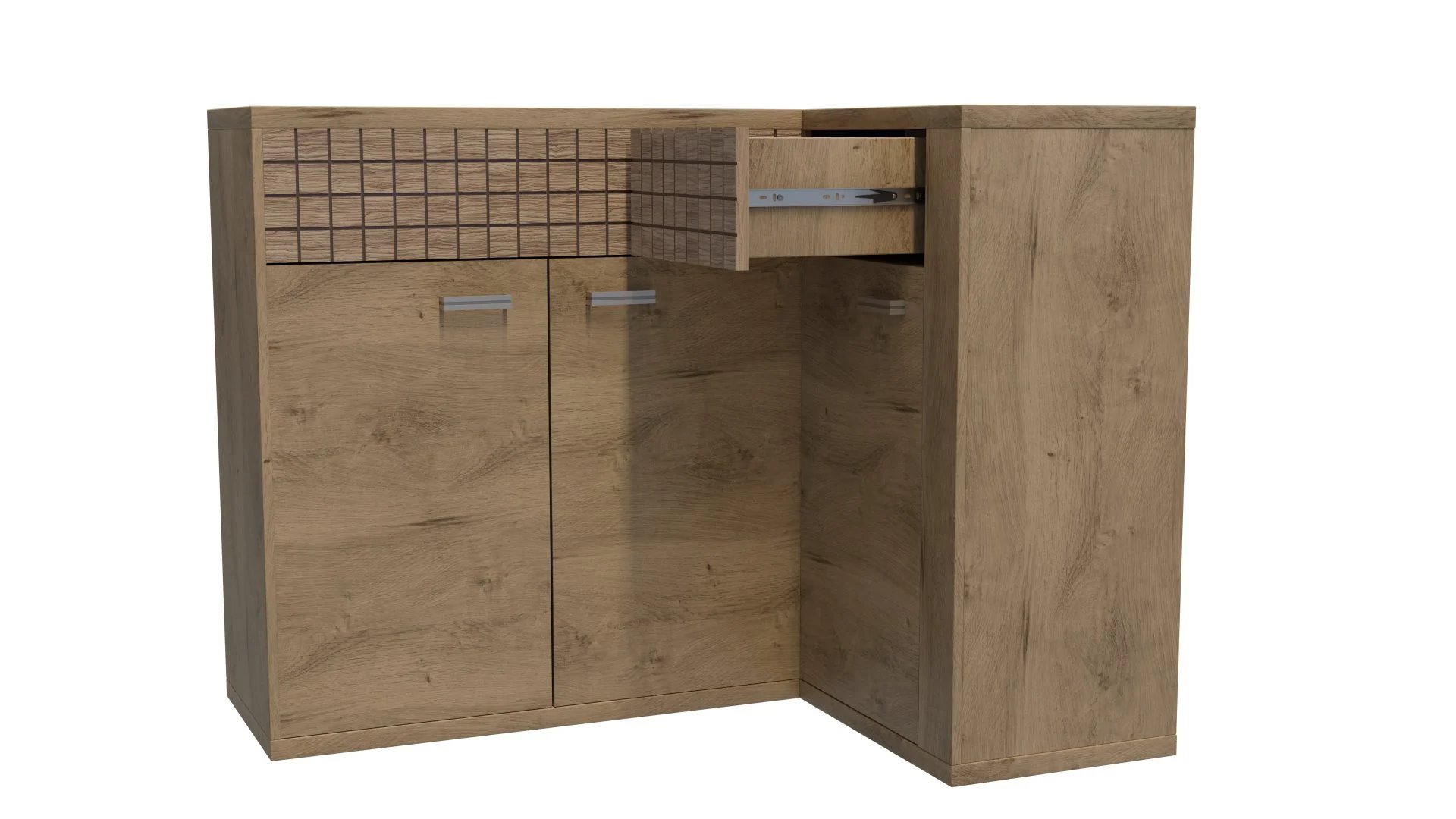 Komoda narożna z kolekcji Natural to funkcjonalny i estetyczny mebel, który doskonale sprawdzi się w różnych pomieszczeniach – od salonu, przez sypialnię, aż po przedpokój. Narożna forma pozwala optymalnie wykorzystać przestrzeń, jednocześnie zachowując lekki i uporządkowany wygląd wnętrza.Mebel został wykonany z solidnej płyty laminowanej i wyposażony w trzy szafki. Dwie z nich połączone są wspólną półką, natomiast trzecia posiada oddzielną półkę, dzielącą wnętrze na dwie praktyczne strefy przechowywania. Nad szafkami znajdują się dwie szuflady z systemem Push To Open, który podkreśla minimalistyczny charakter komody i zapewnia wygodę użytkowania.