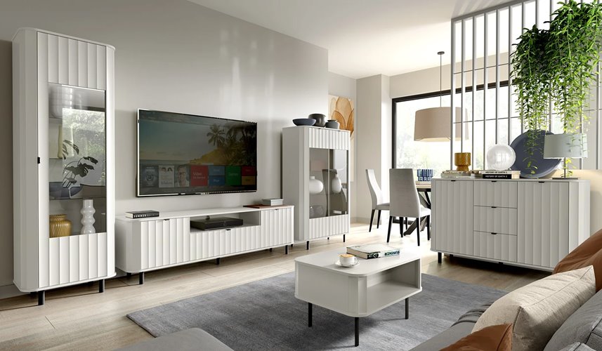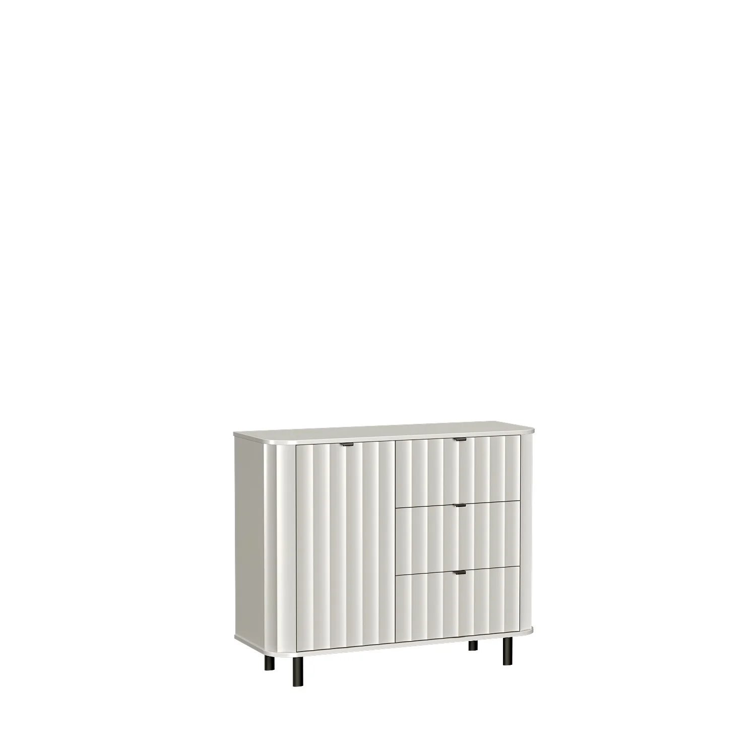 Fronty komody wykonano z frezowanej, foliowanej płyty MDF, która nadaje meblowi nowoczesnego, a zarazem eleganckiego charakteru. Całość osadzona jest na czarnych, metalowych nogach, gwarantujących stabilność, trwałość oraz łatwość sprzątania pod meblem. Czarne metalowe uchwyty subtelnie podkreślają bryłę, wprowadzając delikatny industrialny akcent.