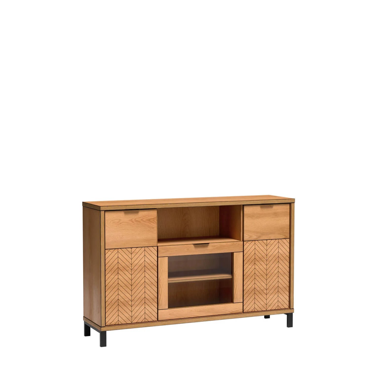 Centralną część mebla stanowi szafka z przeszklonym frontem, wewnątrz której znajduje się półka dzieląca przestrzeń na dwie funkcjonalne strefy. Przeszklenie nadaje komodzie lekkości i sprawia, że doskonale nadaje się ona do wyeksponowania dekoracji, książek lub eleganckich dodatków.