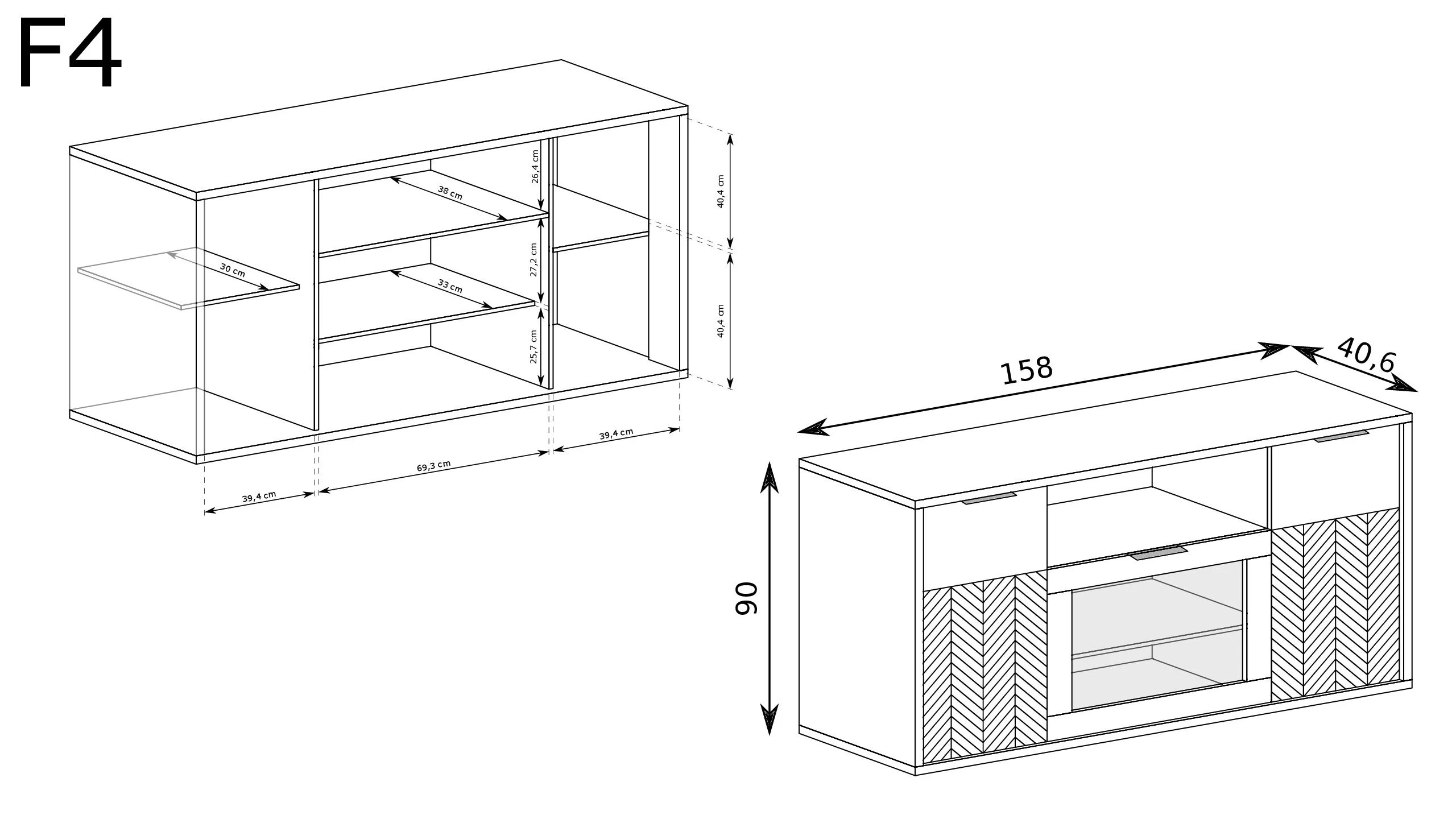 Po bokach komody znajdują się dwie zamykane szafki, z których każda została wyposażona w praktyczną półkę. Takie rozwiązanie pozwala na wygodne przechowywanie większej ilości rzeczy – od dokumentów i tekstyliów, po akcesoria domowe czy zastawę.