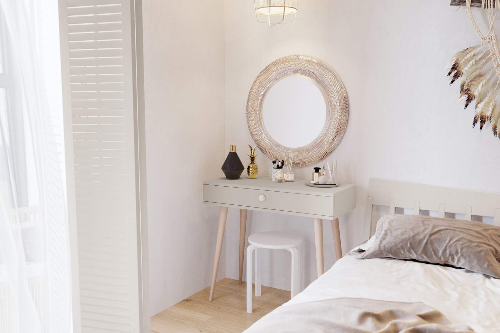 Dzięki głębokości blatu 39 cm, konsola BOHO może pełnić również inne funkcje. Świetnie sprawdzi się jako małe biurko do pracy lub toaletka do sypialni. Wysokie nogi umożliwiają wsunięcie siedziska pod blat, co pozwala oszczędzić przestrzeń i zachować porządek.