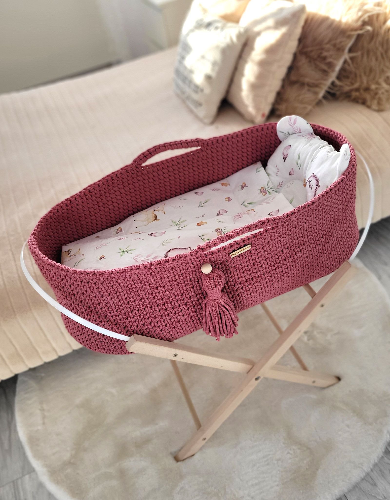 W zestawie: kosz Mojżesza z doczepionym frędzlem w stylu BOHO, materacyk Silver w pikowanym pokrowcu, drewniany stojak do kosza.
