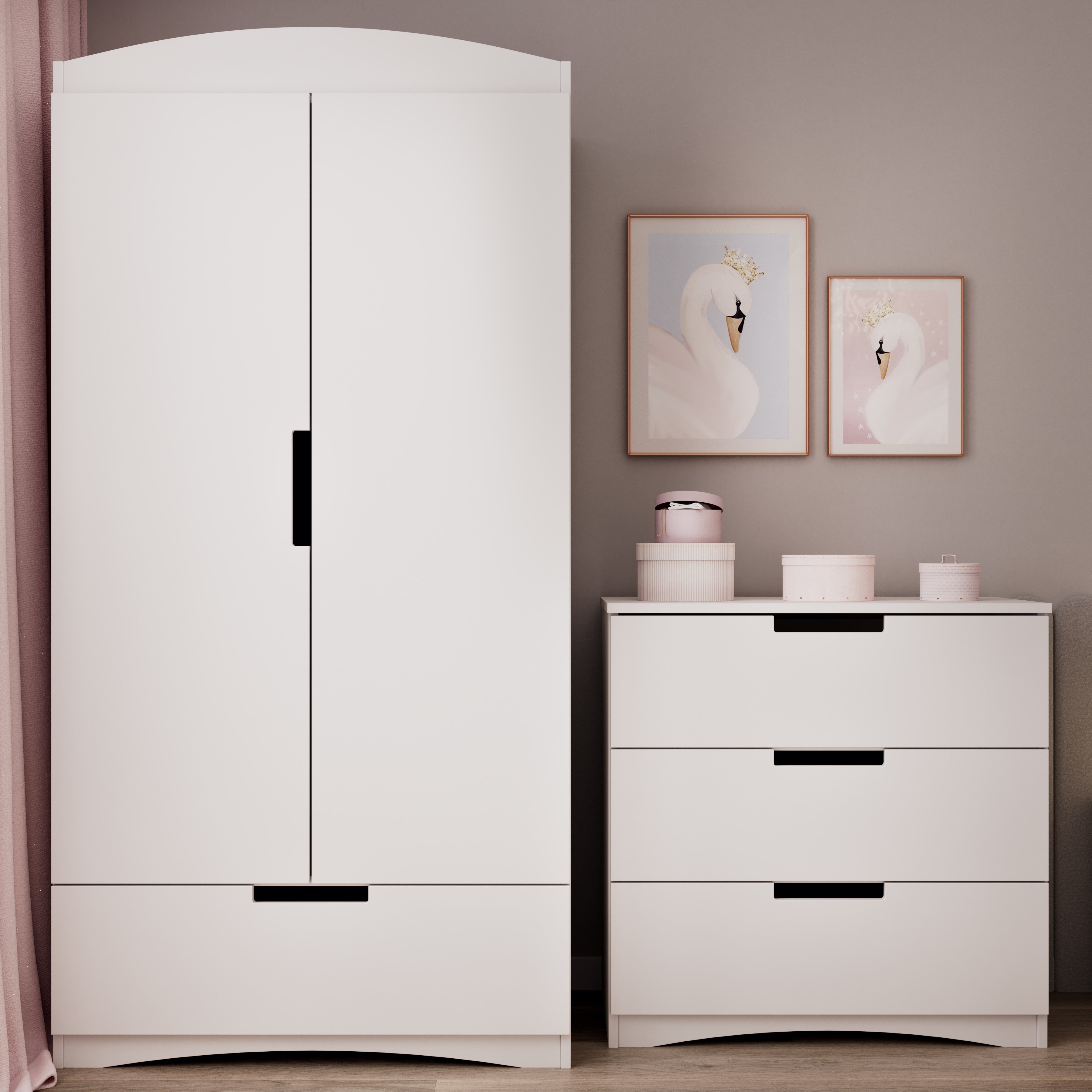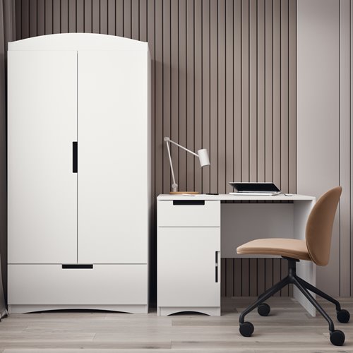 Szafa została wykonana z trwałej płyty wiórowej laminowanej oraz lakierowanej płyty MDF o grubości 18 mm, co gwarantuje jej solidność i estetykę przez długie lata. Dostępna jest w uniwersalnym, białym kolorze, który rozjaśnia wnętrze i dodaje mu lekkości.