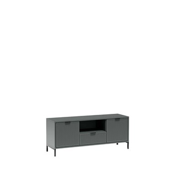W środkowej części znajduje się praktyczna otwarta półka, idealna na dekoder, konsolę lub inny sprzęt multimedialny. Pod nią umieszczono pojemną szufladę, która sprawdzi się do przechowywania pilotów, kabli czy drobnych akcesoriów. Po bokach zaprojektowano dwie zamykane szafki, oferujące dodatkową przestrzeń do przechowywania i pomagające zachować porządek w strefie telewizyjnej.