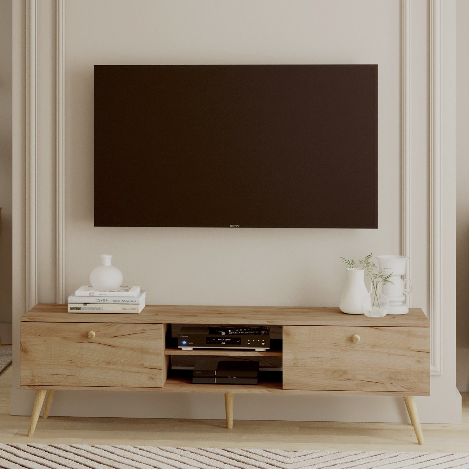 Mebel opiera się na 5 solidnych nogach z litego drewna bukowego, idealnie dopasowanych kolorystycznie do pozostałych mebli z kolekcji. Sztywne mocowanie nóg zapewnia odporność na przesuwanie oraz chroni konstrukcję przed uszkodzeniami. Szafka RTV została zaprojektowana jako część spójnej kolekcji, dzięki czemu doskonale komponuje się z innymi meblami w tym samym stylu.