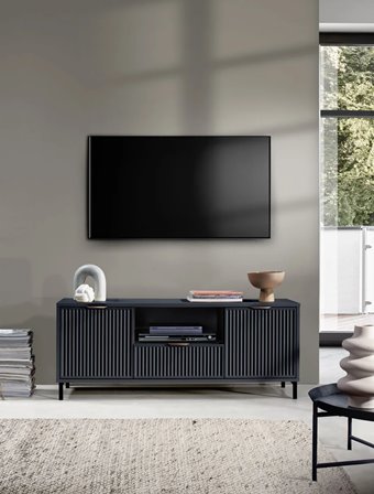 Nowoczesna szafka RTV z półką na sprzęt, szufladą i dwiema bocznymi szafkami. Funkcjonalna i stylowa. Dostępna w kolorach cashmere, indigo i green stone. Wymiary: 165,3cm x 40,6cm x 56,1cm