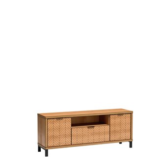 Kasyczna szafka RTV FONTI w kolorze dąb karmel z szufladą, półką na dekoder i bocznymi szafkami. Elegancka, pojemna i funkcjonalna – idealna do salonu.