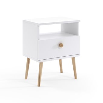Stolik nocny BOHO to stylowy i funkcjonalny mebel do sypialni. Posiada pojemną szufladę, otwartą półkę oraz lekką formę na wysokich drewnianych nóżkach. Idealny także do mniejszych wnętrz.