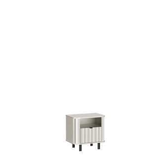 Nowoczesna szafka nocna NOVADO – 7 z otwartą wnęką i zamykaną klapą. Kompaktowa, funkcjonalna i idealna do współczesnej sypialni. Dostępna w kolorach clay gray i białym. Wymiary: 58,6cm x 40,5cm x57cm