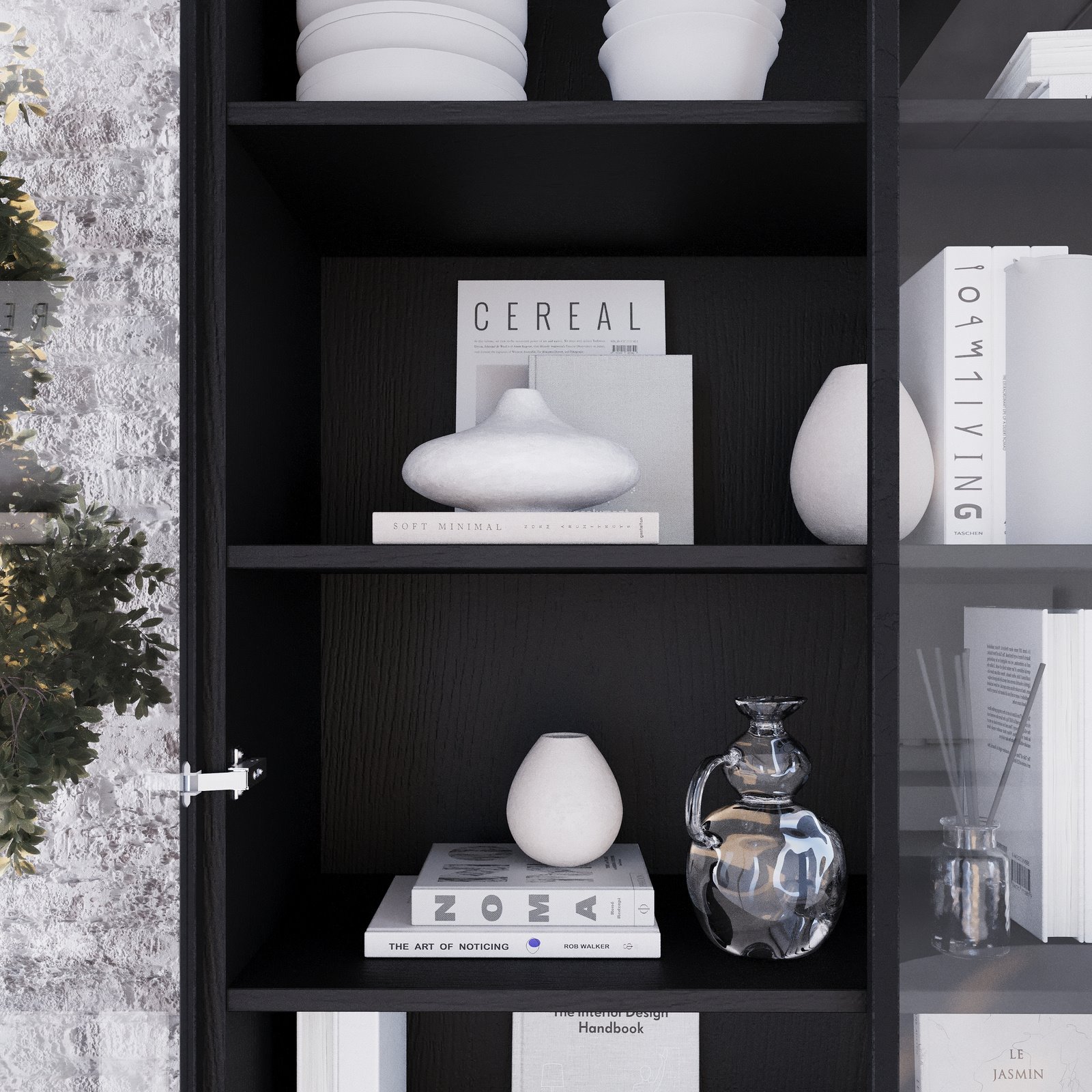 Witryna została wyposażona w szklane drzwi z czarną ramą, które nadają bryle lekkości i pozwalają efektownie wyeksponować zawartość. Przezroczysta szyba doskonale eksponuje dekoracje, książki, ceramikę lub elementy ozdobne, jednocześnie chroniąc je przed kurzem. Drzwi osadzone są na sześciu solidnych zawiasach, co zapewnia stabilność i komfort użytkowania.